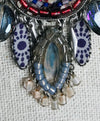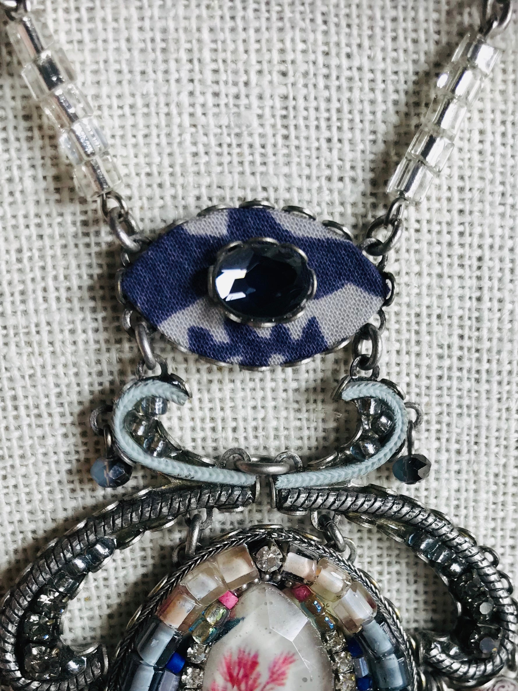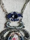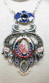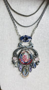 A lovely long three strand neck piece in shades of purple, mauve and pink, with beautiful multi-faceted beads and crystals. This unique piece is really 3 necklace's in. You may choose to detach 1 or both chains and wear just the pendant, or wear just the chain(s) the choice is up to you. It measures 29" and may be adjusted shorter.