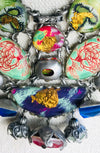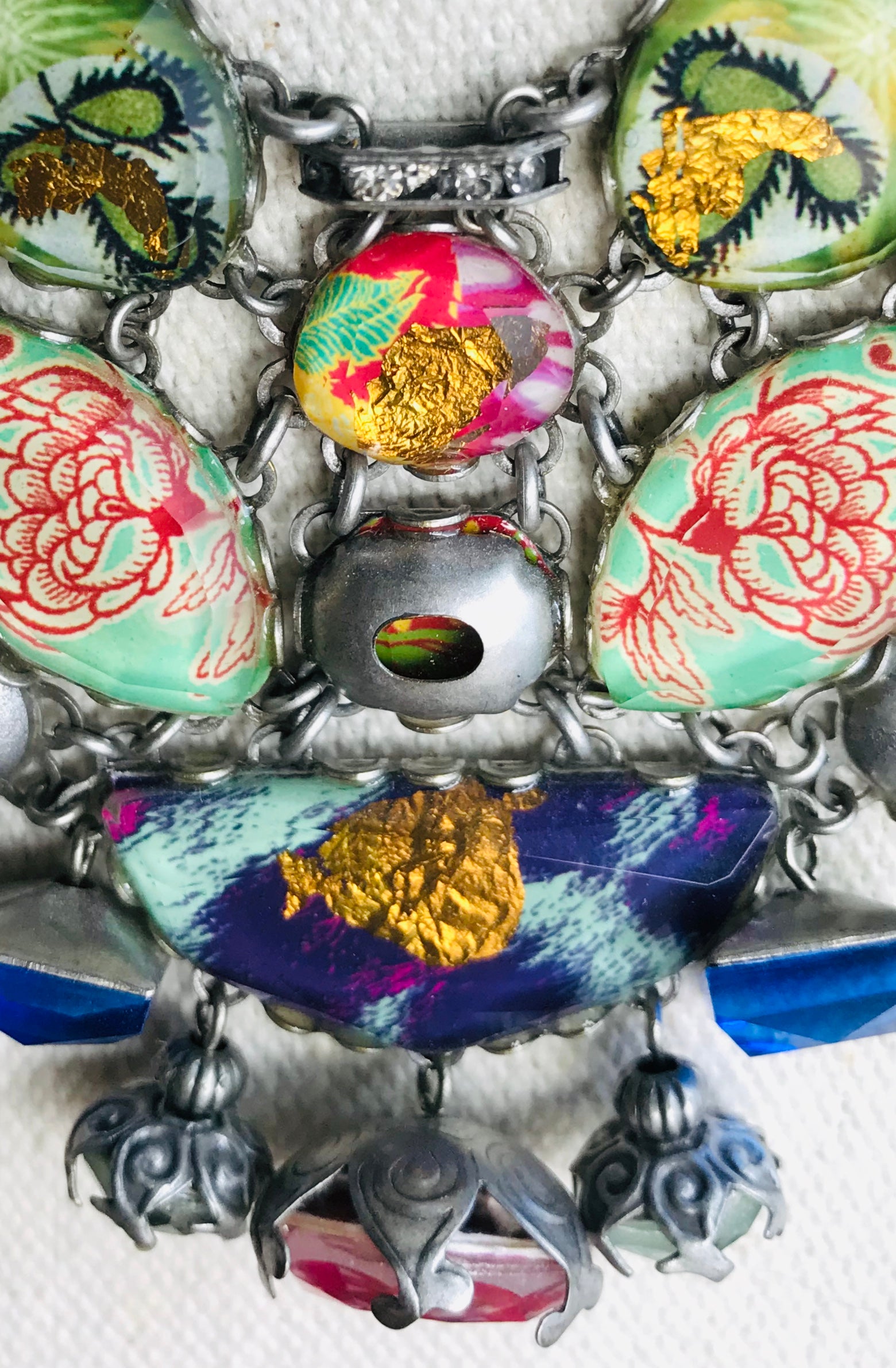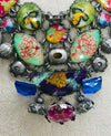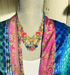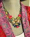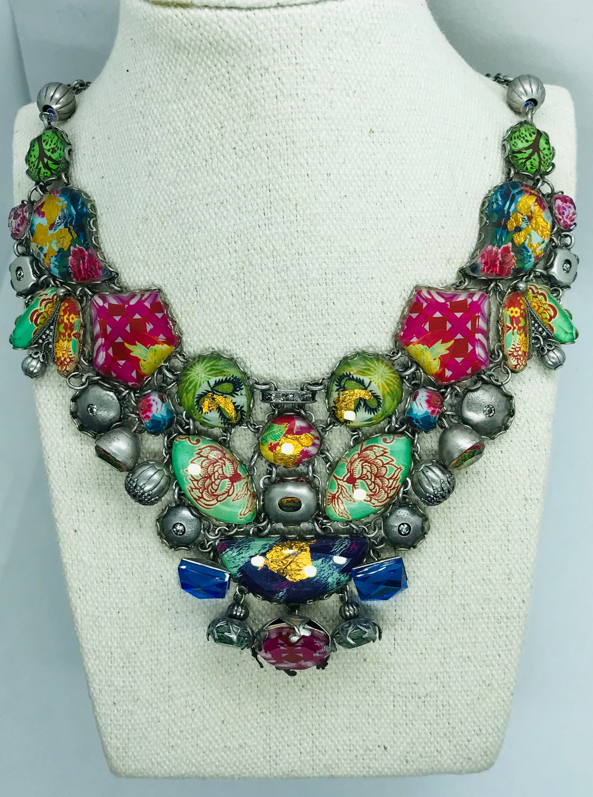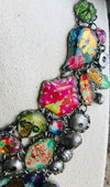 A fun and colorful necklace sure to spark a conversation. This neck piece is full of fun bright colored glass beads in all shades of fuchsia, blues, greens, and accented in gold and silver. This piece measures 18" long and may be adjusted shorter.