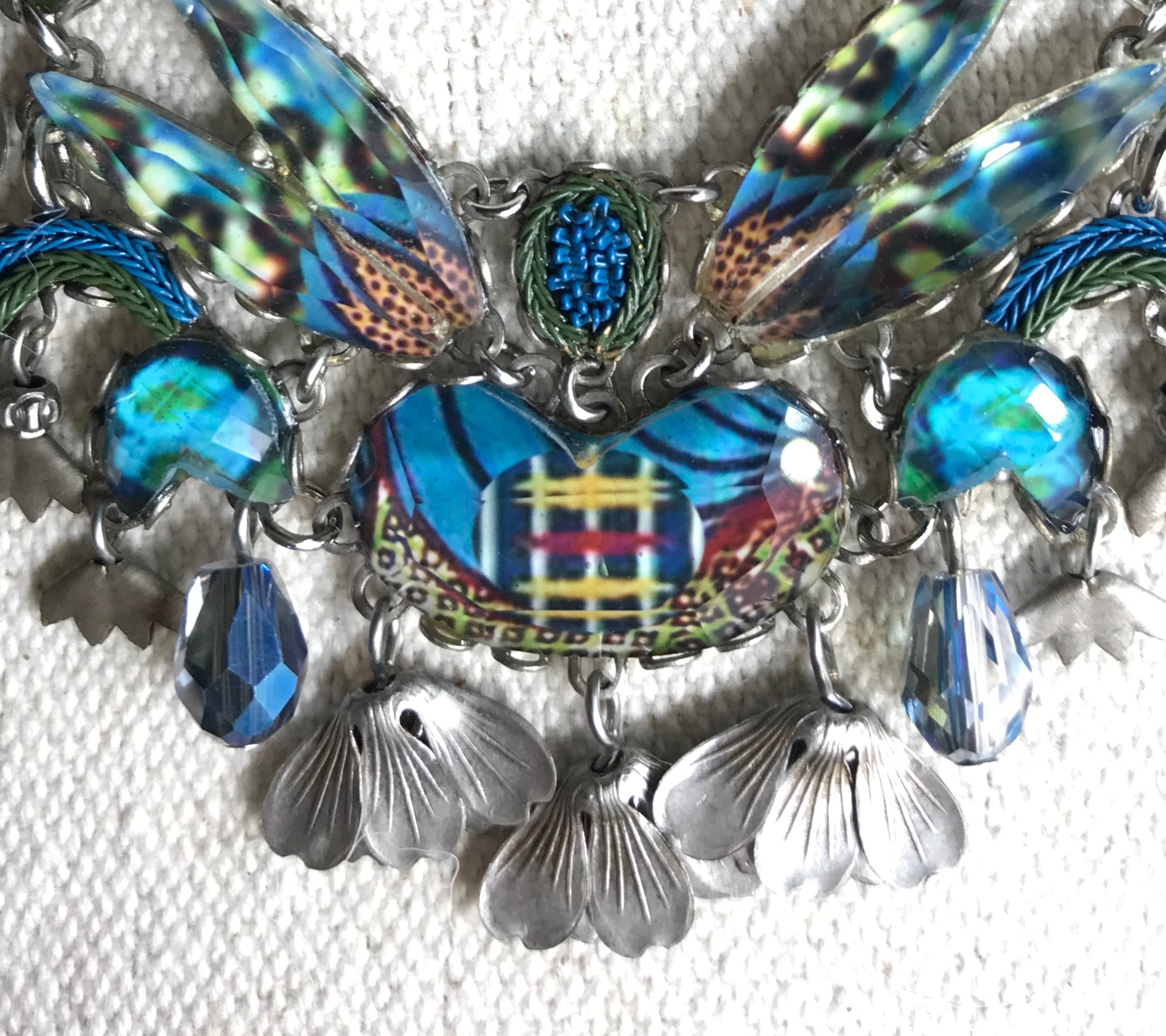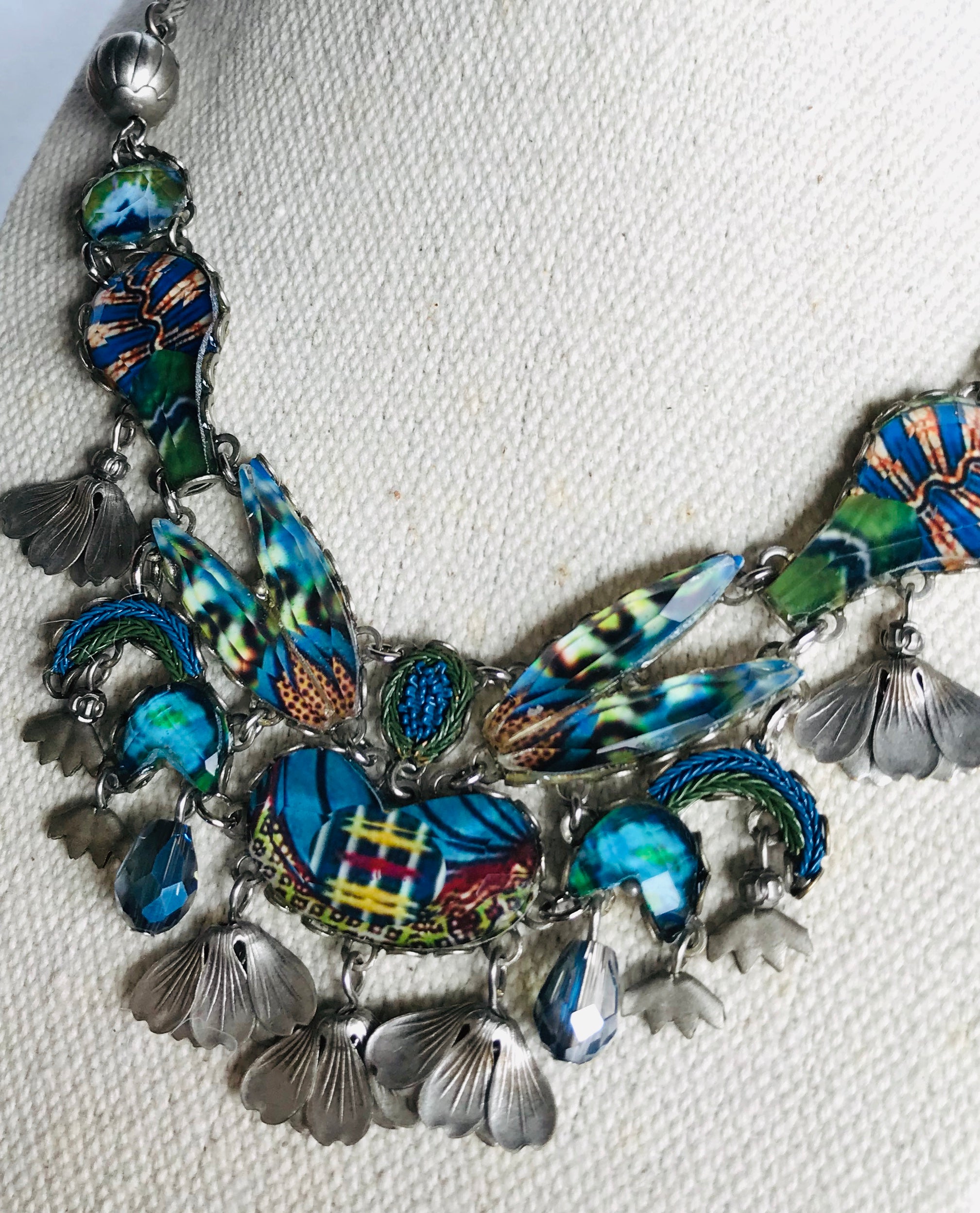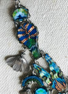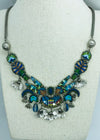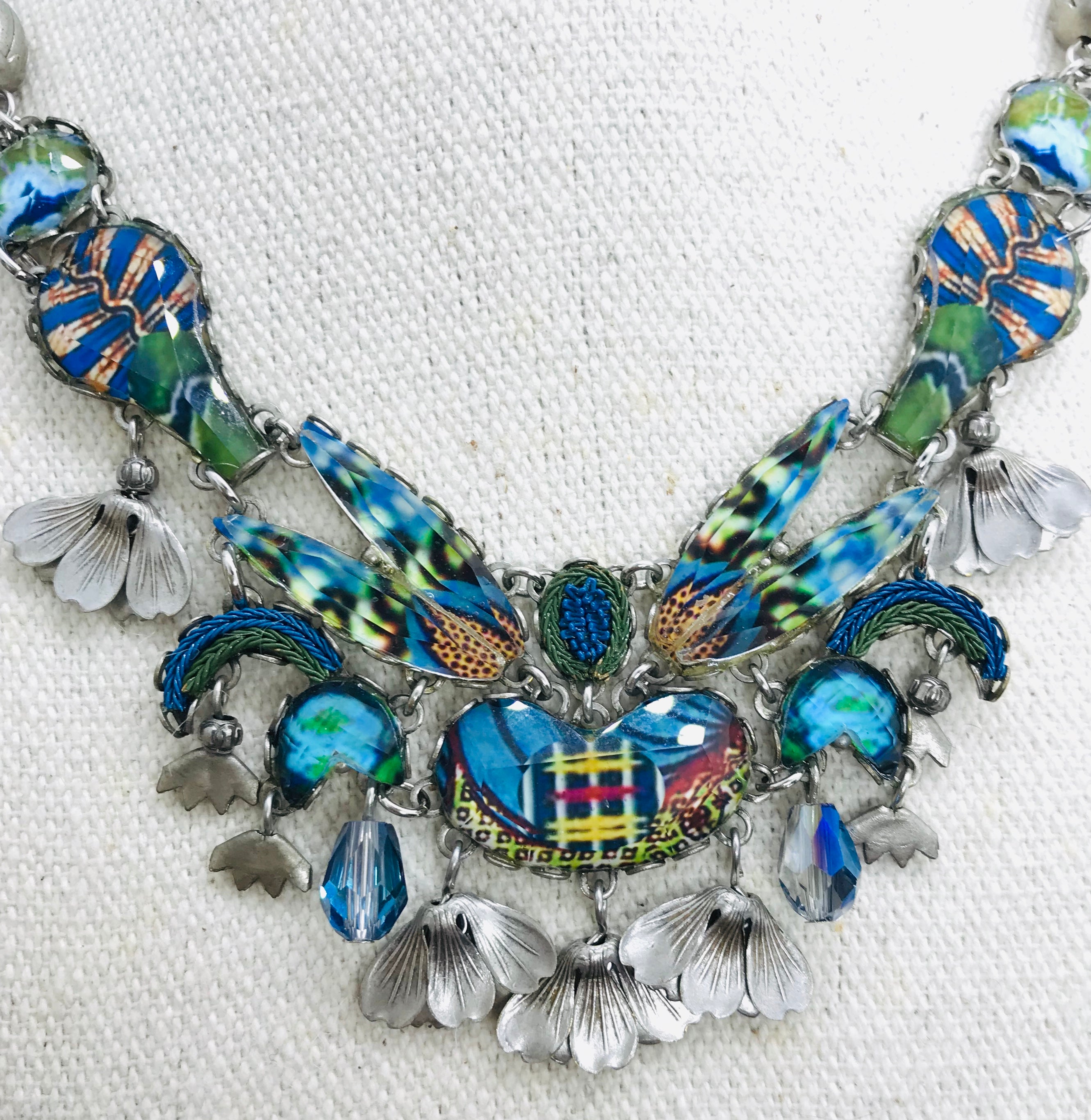 A necklace in all shades of blue, navy, green and rust with blue crystals and silver floral accent beads. Pair it with jeans and a tee shirt or a blazer, no mater what, it will look fabulous! This fun piece measures 18" long and may be worn shorter.