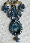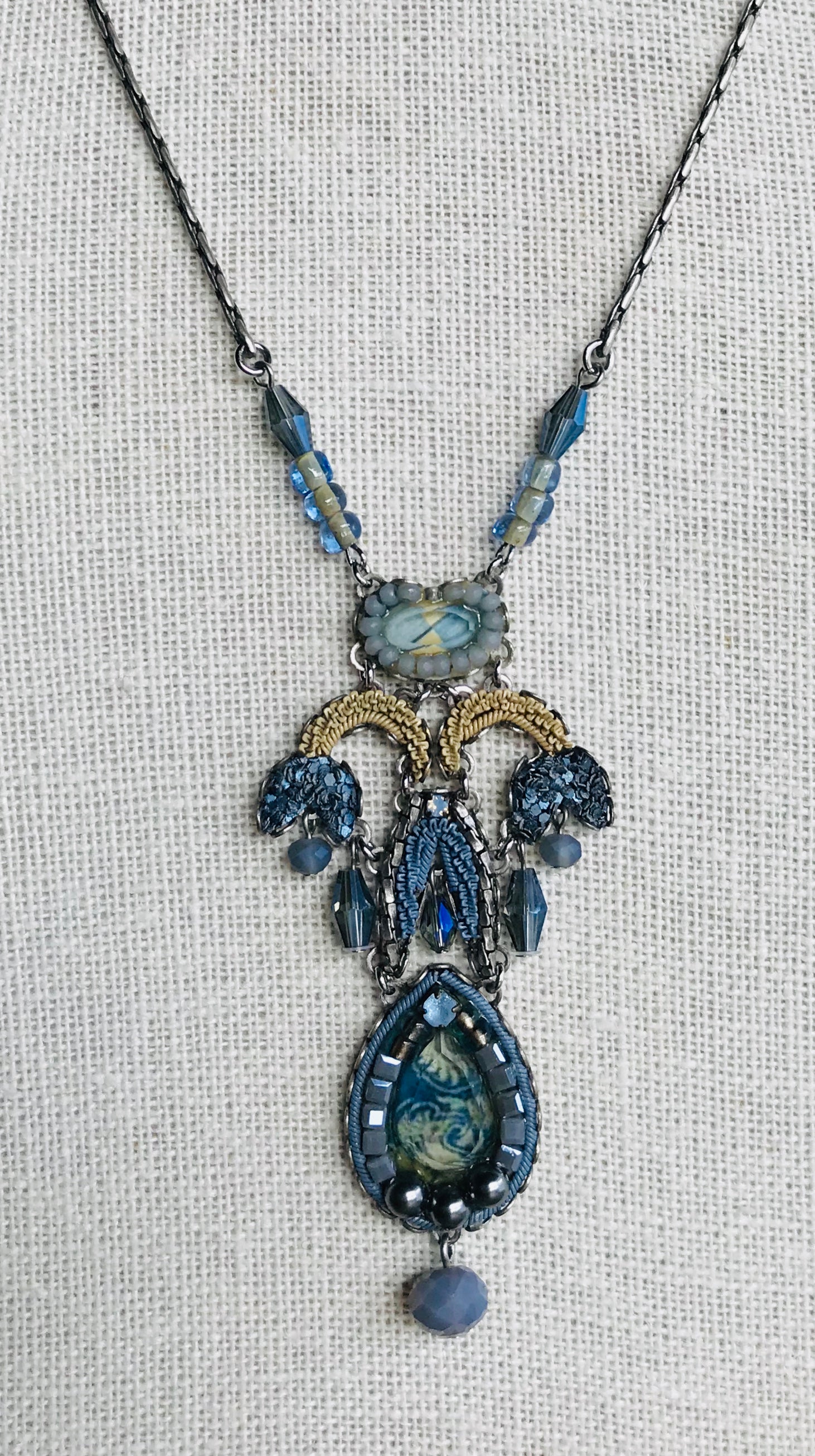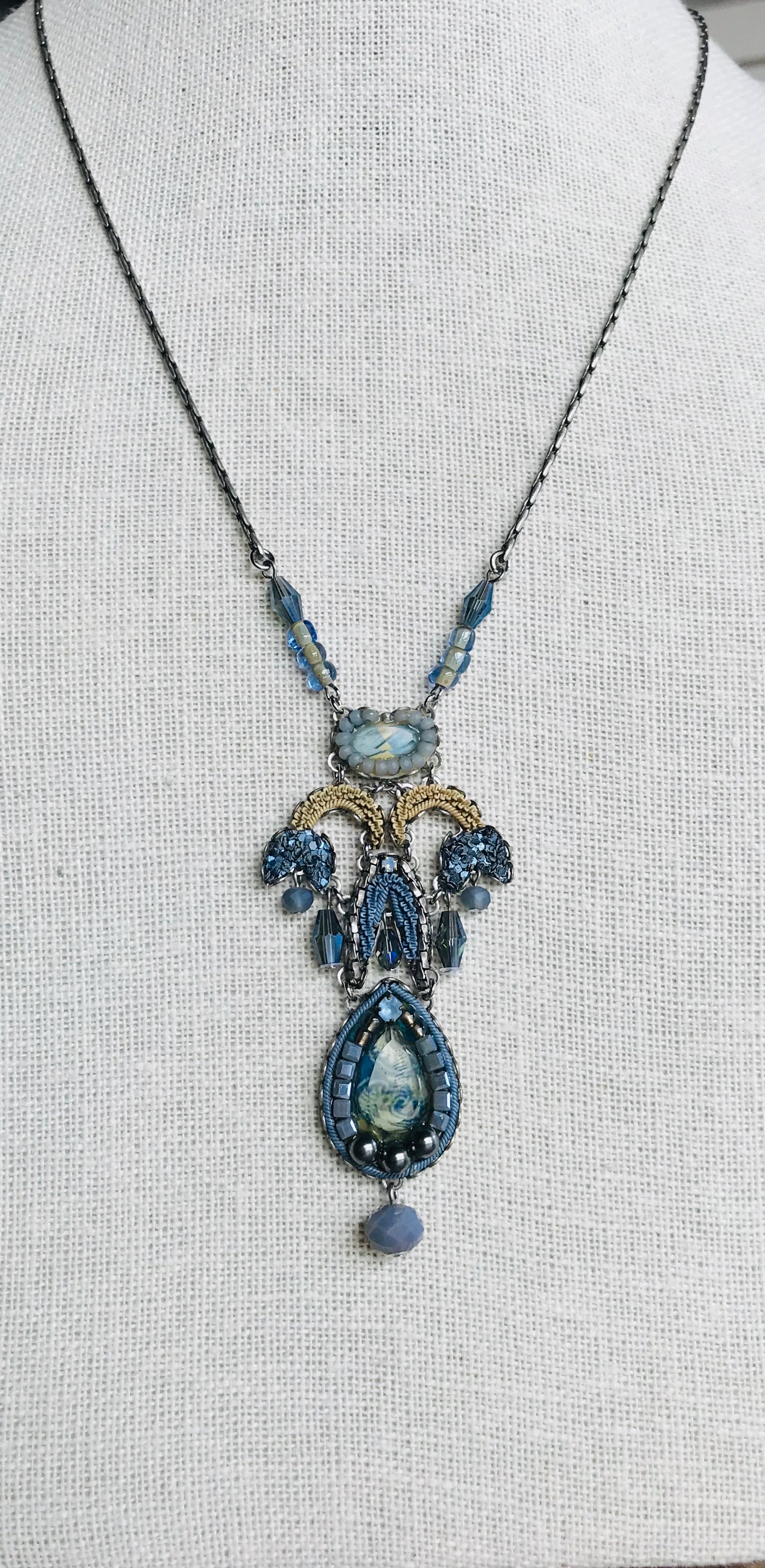 A lovely pendant in smoky shades of blue and grey adorned with corresponding beads and crystals, along with a touch of gold accent. The chain on this piece is 23 " long and may be adjusted shorter.