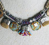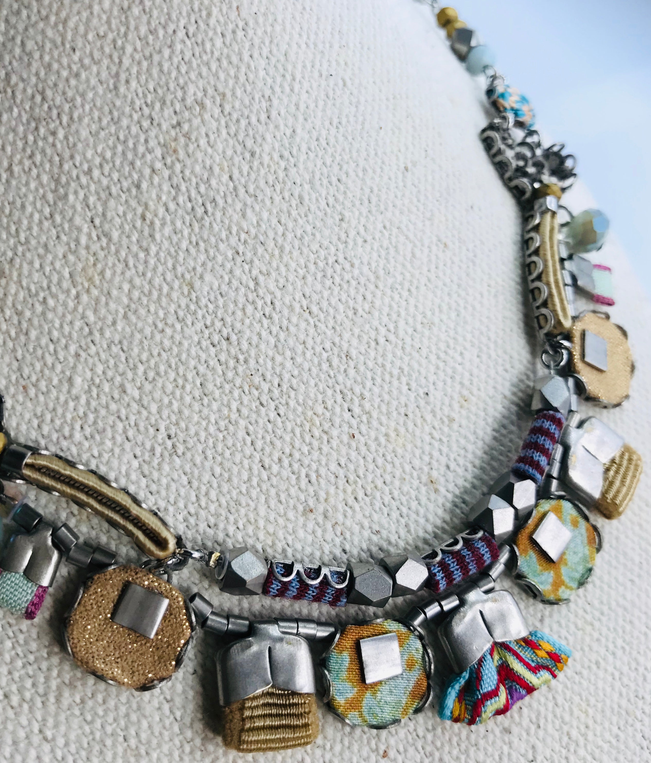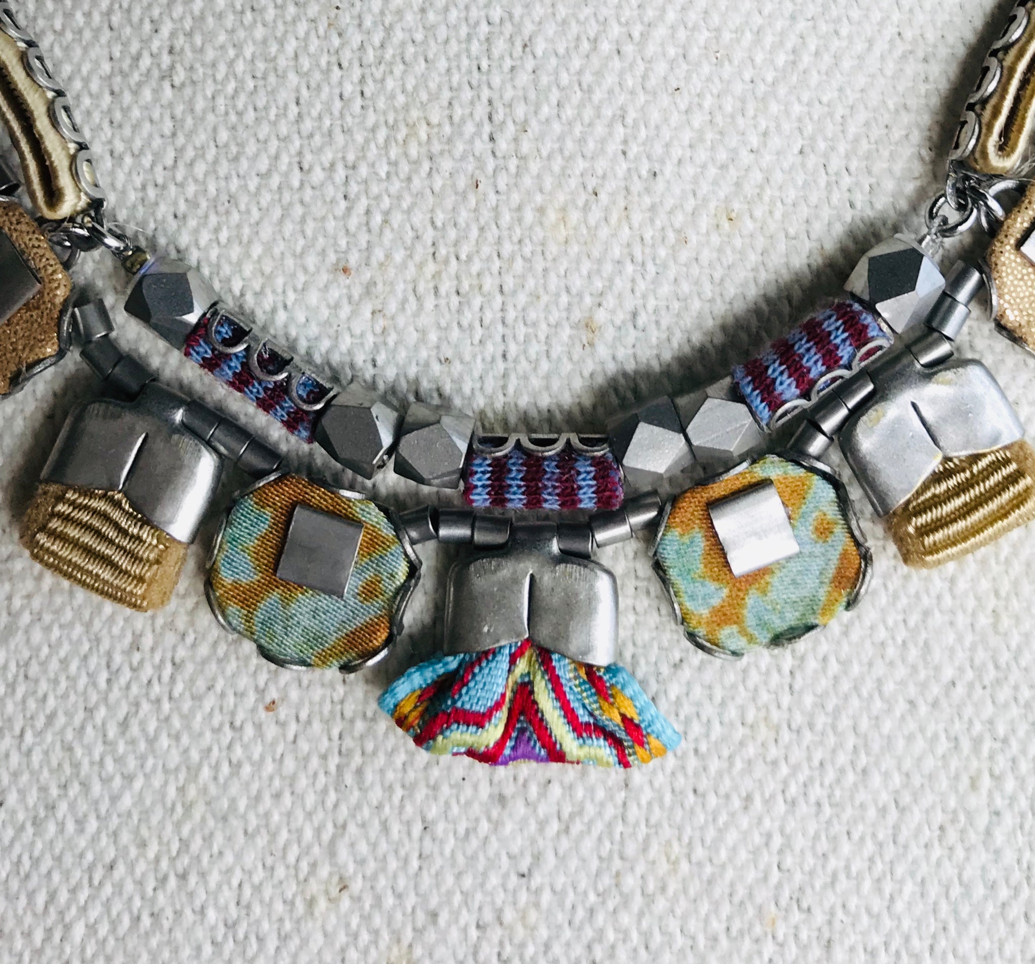 A sweet little necklace that may be layered with other pieces in warm shades of gold, mustard, grey and a splash of burgundy. It is adorned with multi colored fabric beads and crystals. The chain on this piece is 18" long and may be adjusted shorter.