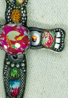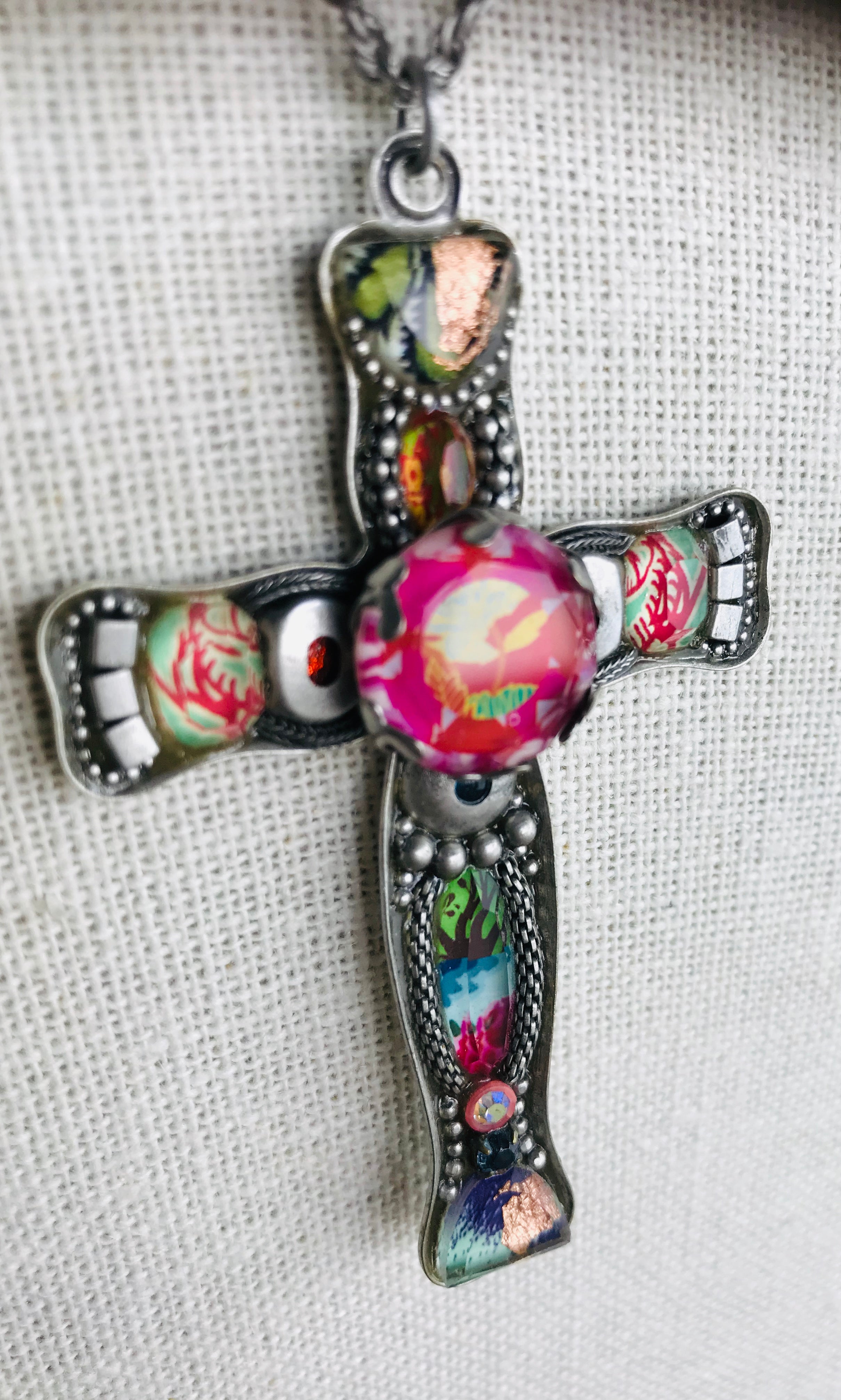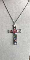 A lovely large cross pendant in rich multi tones on a silver back drop. The chain measures 28 inches and may be adjusted shorter, while the cross measures 3 inches long.