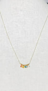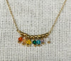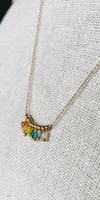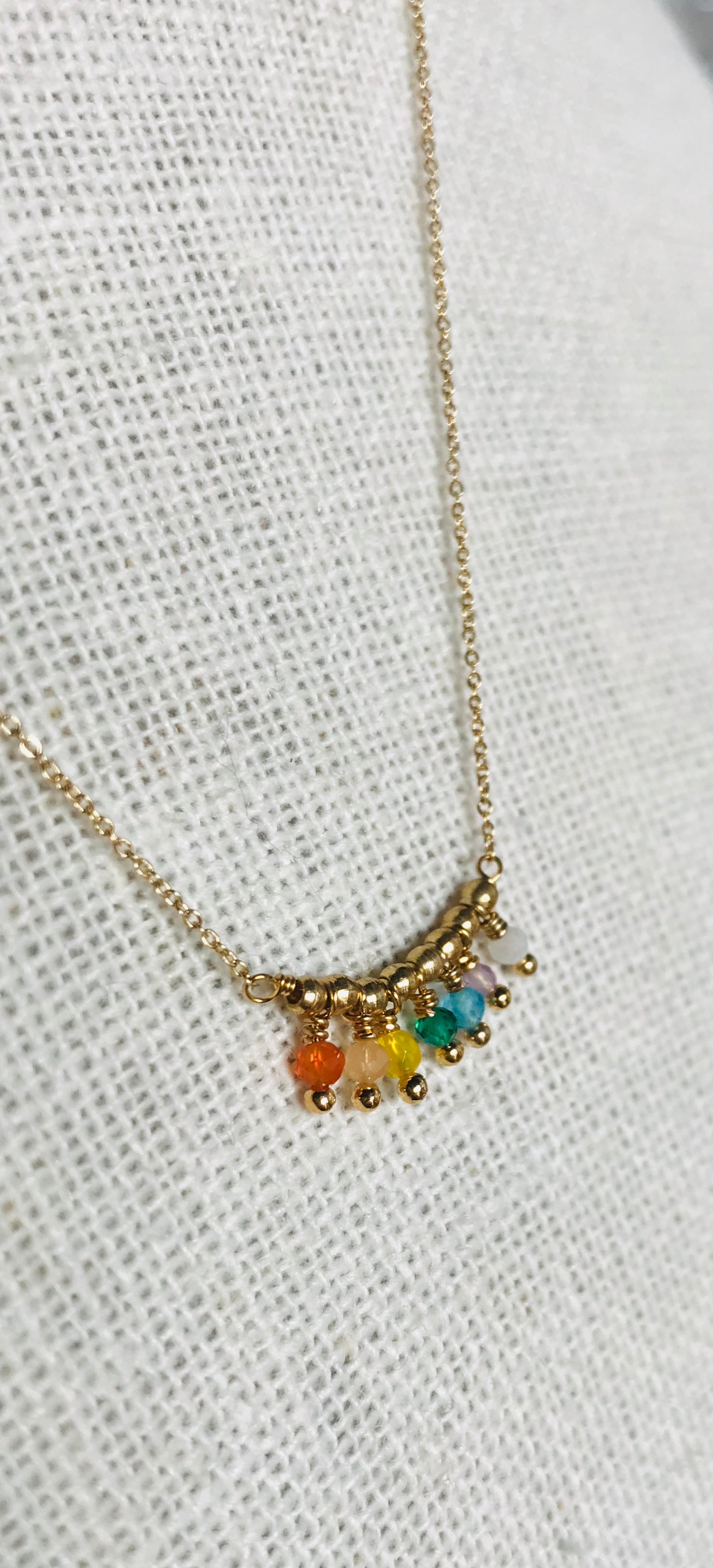 Josie is a tiny and delicate, Gold-plated rainbow necklace of colored crystals. It is on a 16" gold filled chain with a 2" extension.