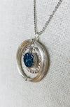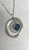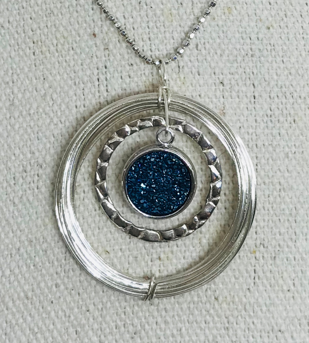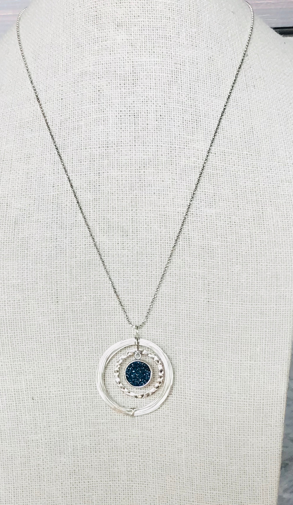 This funky necklace is composed of a Sterling Silver wire frame with a Blue Quartz Druzy center stone. This piece is 18" long and the pendant is 1" in diameter.